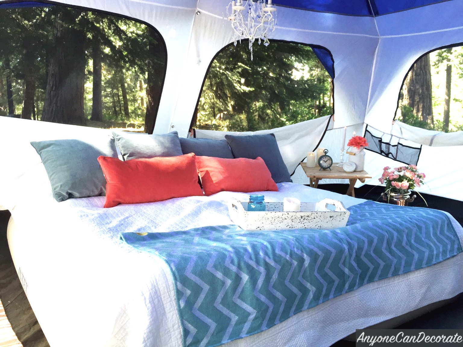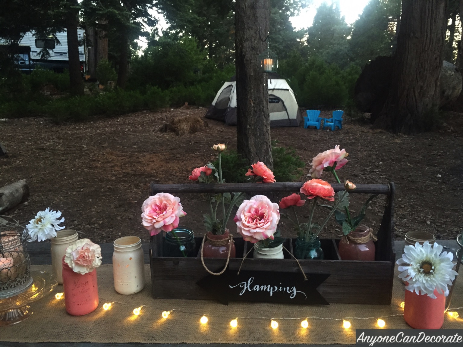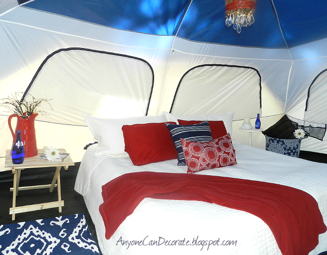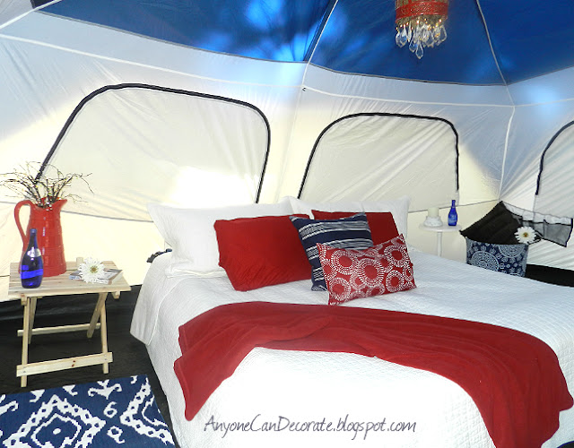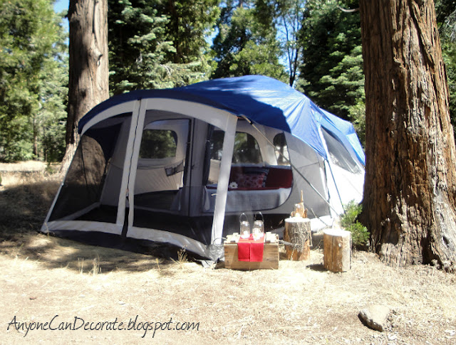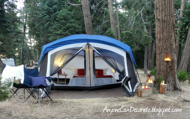 Loving decorating as much as I do, I can't just go camping, so a couple of years ago I decided to start going GLAMPING... which translates to Glamorous Camping. For me "Glamping" means having all the comforts of home all around us and decorating our surrounding space with a comfortable homelike feel.
