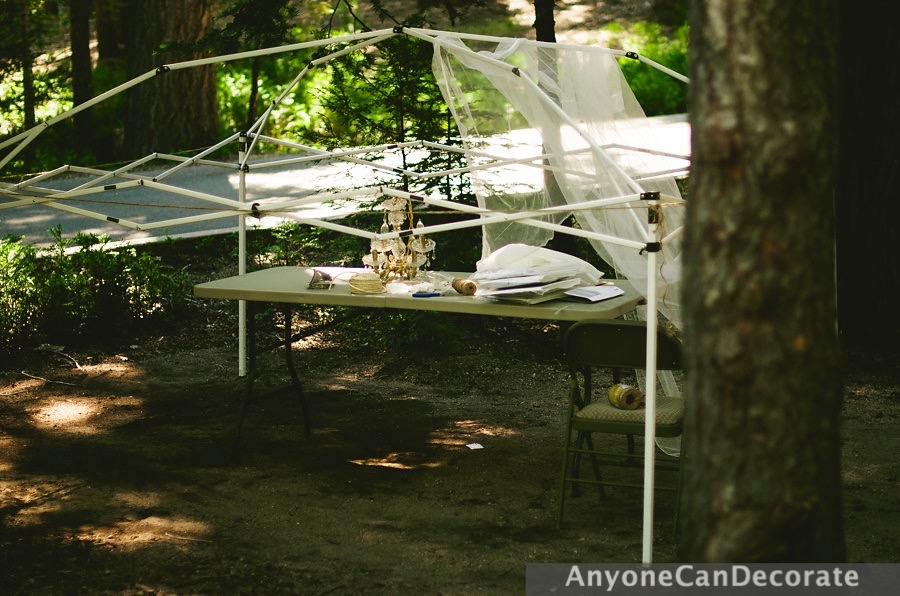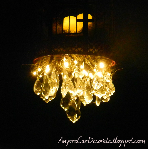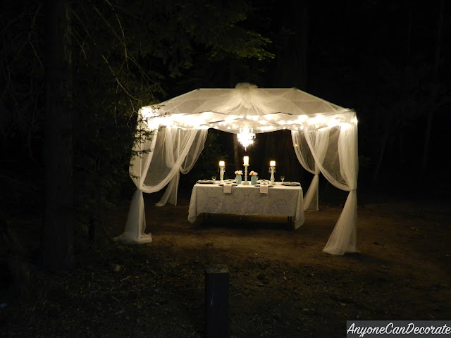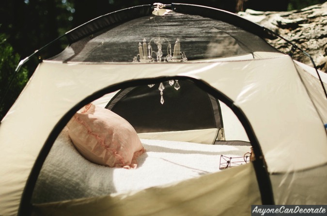 I made this battery operated chandelier from a birdcage that I found for $10 at Marshalls, a strand of LED Lights, some nesting material and a couple of faux candles that were also battery operated. I used a bunch of crystal prisms (leftover from prior crafts) add hung them from the bottom making it feel like a real chandelier. The chandelier added a nice touch of romance to our tent.