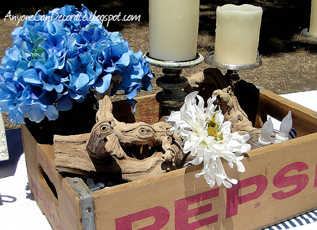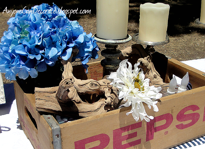 The entire campsite decor was initially inspired by this vintage wooden Pepsi box crate that I found at a flea market a few weeks ago. I paid just $5 for it, and with it I was inspired to go with a red, white and blue theme. Also being that 4th of July/Independence Day was close, I figured patriotic colors were appropriate.