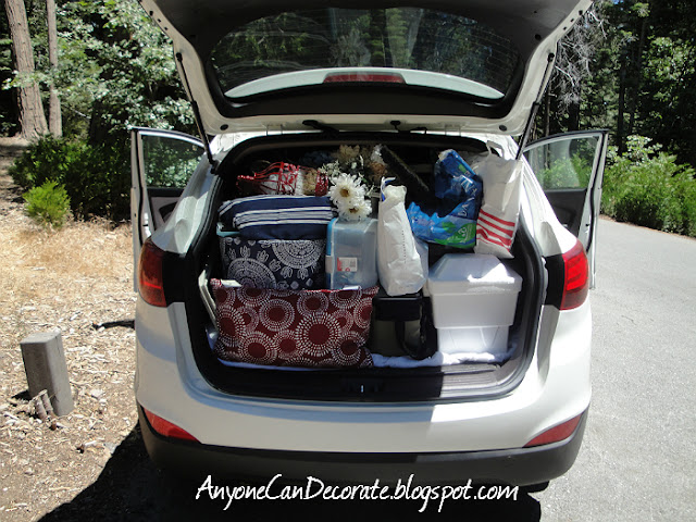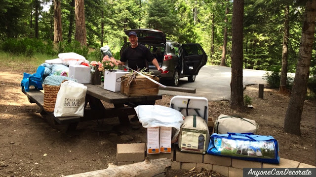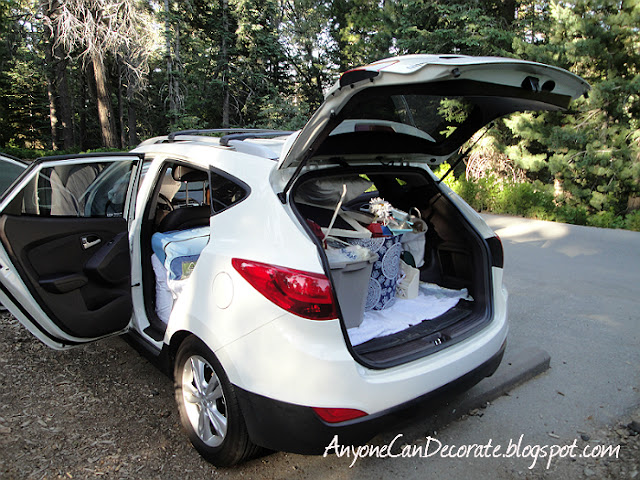 Above is a picture of our car at our camp site after we had already started unloading it's contents. I had it packed literally from top to bottom. Seriously, I could not have fit anything else inside!!! I had so much packed and puzzled in every nook and cranny of our vehicle. Luckily my hubby never complained and is fully supportive of all my decorating craziness :)