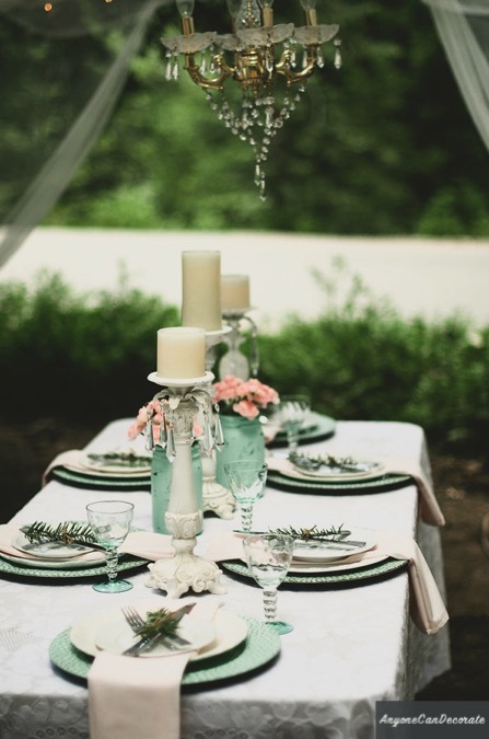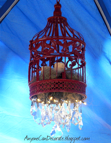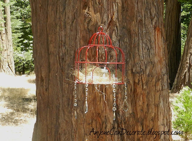 This wall hanging birdcage was found at a thrift store for $3. I painted it, added some nesting material, hung a few sparkling crystal prisms from it and popped in a couple of battery operated tea-light candles into it. Since we were outdoors, I incorporated a few birdcages and birdhouses into the decor.