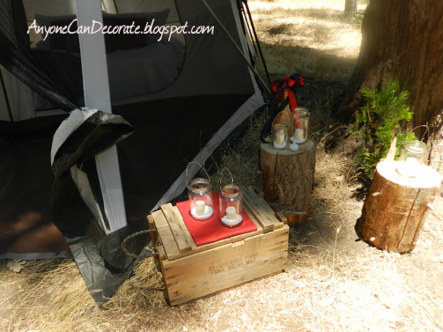 The wooden box below is an old grenade crate with rope handles that I found at a flea market for only $3. I've since seen them for sale on ETSY and eBay for anywhere from $50 to $150... I so love finding bargains for just a few dollars! I used the crate to transport all of my hanging mason jars and then was able to use it as a decorative piece at the camp site... love it!