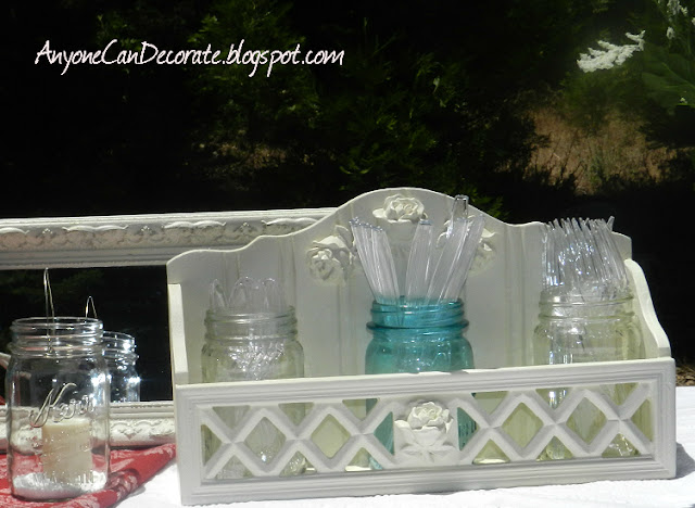 Below is a wooden box that I added rose furniture appliques to and then I painted it Heirloom White and distressed it for a shabby look. I added mason jars to it to and used them to hold our designer plastic silverware (hehe)...